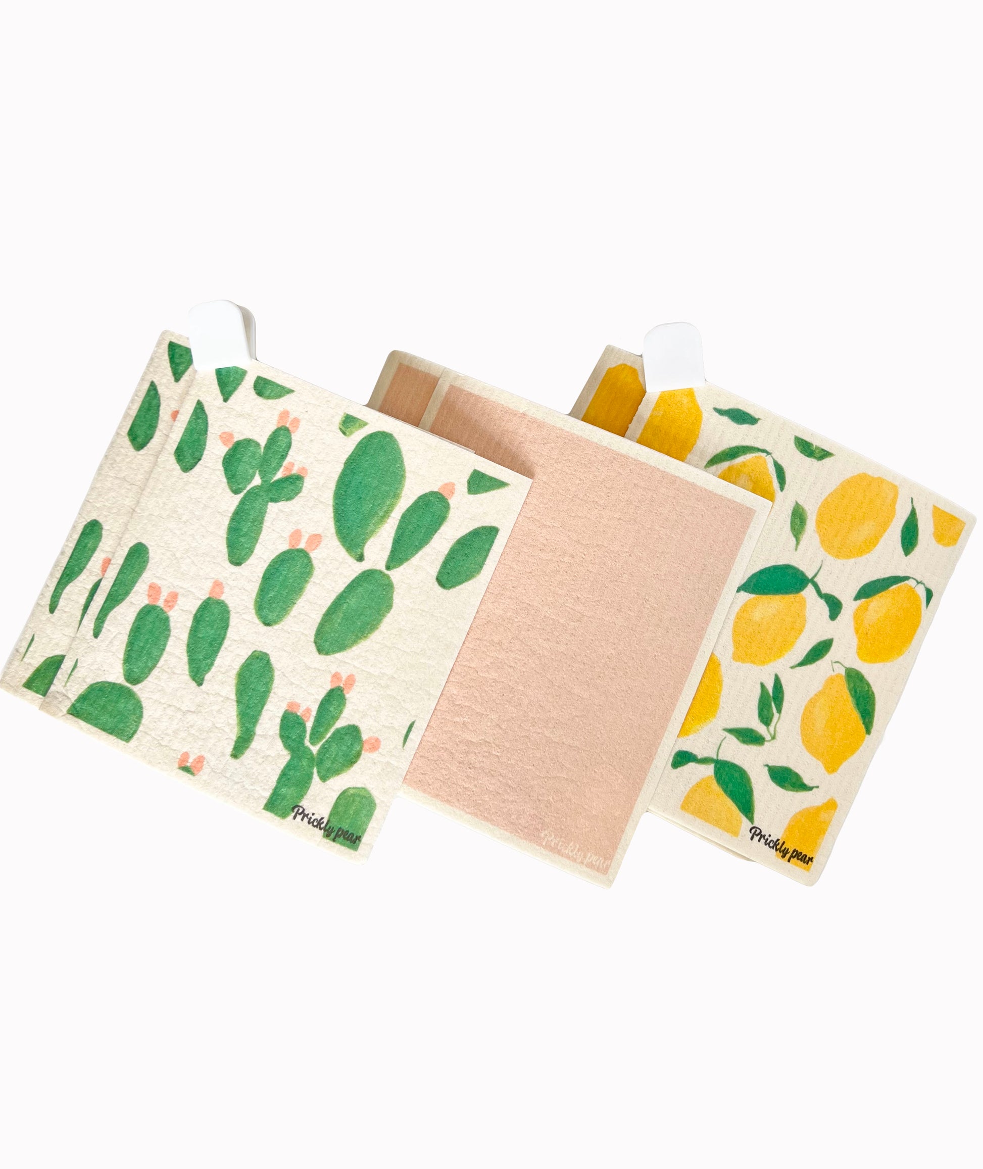 Place the reusable towels on the top rack of the dishwasher once a week or after large cleanups. Wring it out and hang it with the Prickly Pear hanging clip.